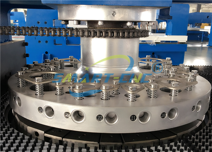 3. Turret Organization:Adopt high strength nodular cast iron to cast into integral thick turret mould plate, thickness is 80mm, through heat treatment to get rid of internal stress, rigid good, precision stability, impact resistant ability good; greatly improving mould service life;